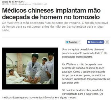 CNN电视台网站热议中国医生断手移植脚踝手术