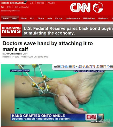 中国医生成功实施断手移植脚踝手术,不仅中国网友大为惊奇,美国CNN电视台网站也在头条醒目位置予以报道。