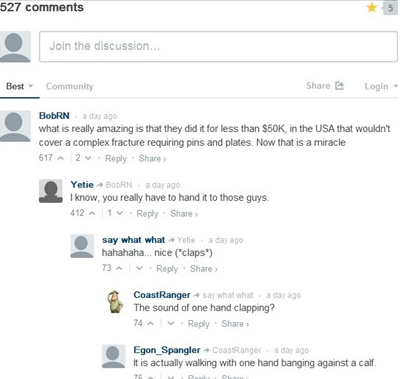 @jman822:“这就是为什么中国将在21世纪成为全球第一。我无法想象美国医生能做出同样的事情。医院会被保险公司烦死(如果这名伤者有保险的话),就算双方达成协议,那只断手早就救不回来了。另外,最后的账单妥妥地超过30万美元,然后伤者就等着一辈子还债吧。”