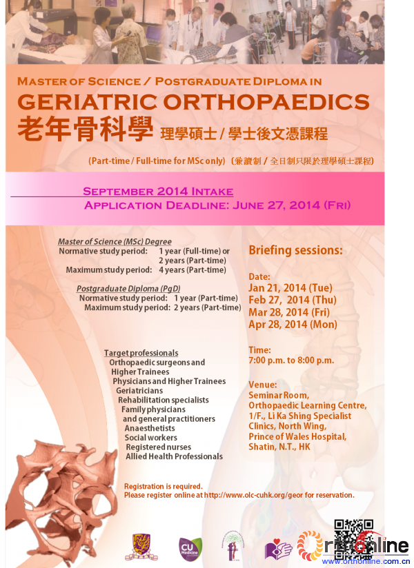 这次香港中文大学医学院矫形外科及创伤学进修培训中心举办的“老年骨科学硕士学位课程及学士后文凭课程(2013/14学年)”现正招生,同时本年度加设了全日制硕士学位课程,方便国内及外国的医护专才俢读,并可以一年内以学生签证的身份留港就学。
