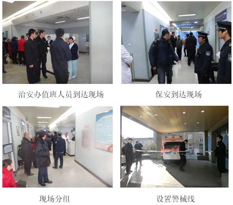 1月8日上午10点,创伤烧伤抢救中心护士分别给治安办和保安值班室打电话,有成批伤患者由“120”急救车马上送到我院急诊,请求现场维持秩序。10点01分,急诊保安率先到达现场,随后治安办人员携带对讲机、照相机、警戒线到达现场。治安办值班班长赵宝柱带领治安办2人和保安2人组成维持秩序组在急诊入口至抢救室之间拉设警戒线,建立抢救通道,疏导围观人员,保障抢救通道畅通;其余人员组成协调组协助医护人员将伤员送至抢救区。待全部伤员进入抢救区后,维持秩序组在护士站、抢救室入口设立警戒线,严禁无关人员进入,并将电梯停运在一层待命,随时将需要手术的病人送至手术室。治安办主管韩晓冬负责了解致伤原因,如发现刀伤、枪伤等涉及刑事犯罪、恐怖袭击致伤时,及时汇报并与公安机关取得联系。中控室主管周伟与值班人员全程紧盯监控屏幕,保持与现场的紧密联系,随时听从演练总指挥的命令。