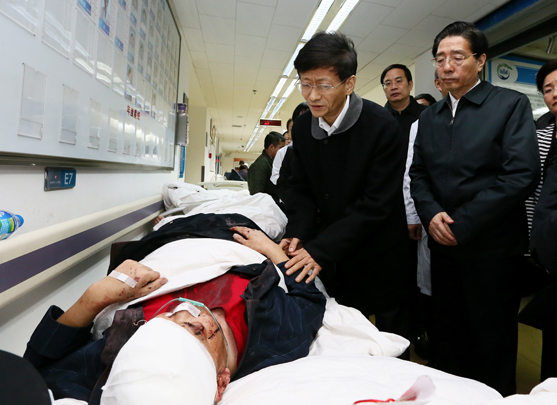 中央政法委书记孟建柱来到昆明市第一人民医院看望慰问受伤群众和遇难者家属