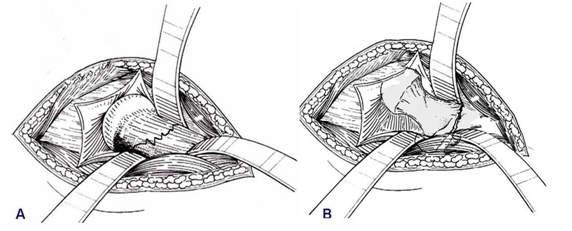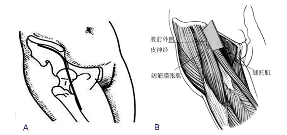 A, 皮肤切口;B,沿缝匠肌和阔筋膜张肌之间入路