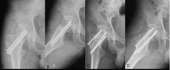 A,B,患者术前髋部正侧位片示股骨颈骨不连;C,D,患者术后髋部正侧位