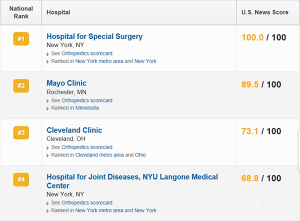 近日,U.S. News and World Report回顾了全美1646个医院骨科综合实力,在这其中,2010年、2011年和2012年连续3年住院疑难手术患者超过338名的医院进行了排名,排名依据包括:专家声望、生存率、患者满意度、患者数量、护理强度等方面,以下为排名前10位的医院,看看你知道哪个?
