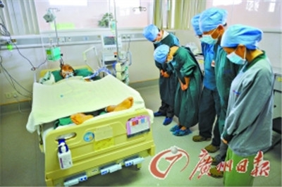 上图为珠三角某医院患者过世后,医护人员在其病床前默哀。但是,有医生和患者担心,一旦实施以住院患者死亡率来作为综合医院服务能力标准后,医院可能会拒收一些病情复杂的危重病人。(资料图片)记者 卢政摄