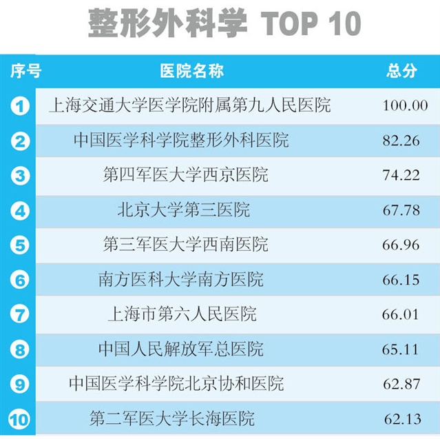 2014年度中国医院科技影响力排行榜(整形外科学)