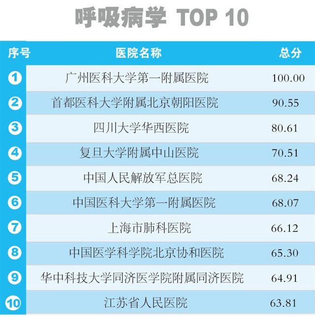 2014年度中国医院科技影响力排行榜(呼吸病学)