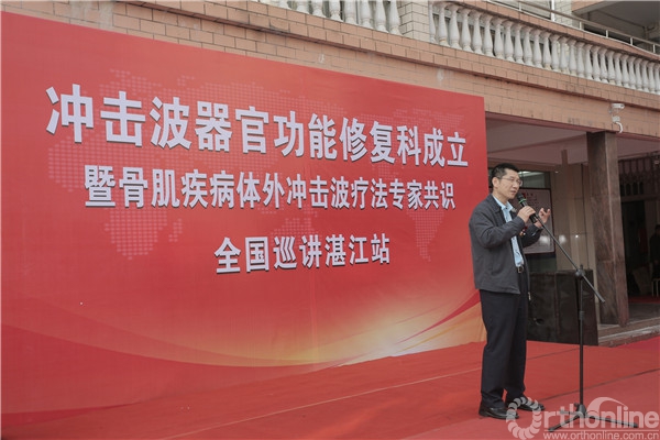 2015年01月18日湛江中医院冲击波器官功能修复科揭牌仪式暨骨肌疾病体外冲击波疗法专家共识全国巡讲活动湛江站成功举办。湛江市有关领导、北京大学第一医院郭应禄院士、冲击波医学专业委员会邢更彦主任委员及其他相关领域的专家学者出席了揭牌仪式并进行了骨肌疾病体外冲击波疗法学术讲座。此次湛江中医院冲击波器官功能修复科的成立,表明了体外冲击波疗法正在逐步应用到医学相关多学科领域,不仅仅应用于泌尿系结石、骨肌系统疾病(股骨头坏死、骨折延迟愈合及肌腱末端疾病等)治疗中,在心肌缺血、烧伤整形、皮肤再生、骨质疏松、肿瘤靶向等方面均具有治疗的指导性意义。与传统手术治疗相比,体外冲击波疗法具有疼痛缓解迅速、并发症少、治疗周期短、治疗风险低、治愈率高等诸多优势。随着人们生活方式的改变和老龄化社会的到来,体外冲击波疗法必将发挥其优势,给老百姓的生活带去福音。