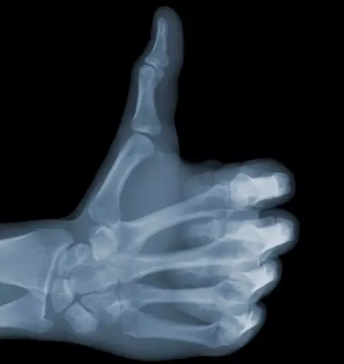 (1895年,伦琴发现了X线。同年12月22日,伦琴给他太太拍摄了手部的X线片。这是第一张人体X线摄影,手指上那个黑咕隆冬的物体是婚戒。之后不久,X线就开始应用于医疗)