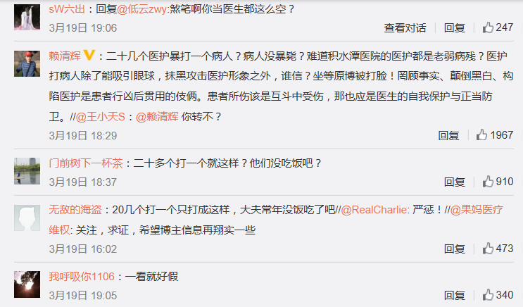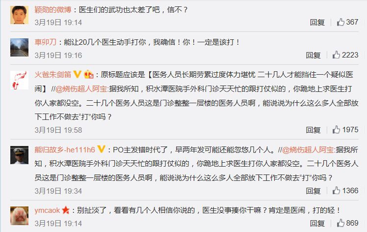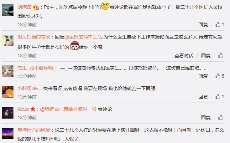 很多网友纷纷对此消息进行质疑。@周ECKHAM 说:别的医院就算了,北京积水潭的医生有空去打架?那门口排的队不得炸了?北京积水潭医院医生@烧伤超人阿宝 也发微博称:据我所知,积水潭医院手外科门诊天天忙的跟打仗似的,你跪地上求医生打你人家都没空。二十几个医务人员这是门诊整整一层楼的医务人员啊,能说说为什么这么多人全部放下工作不做去“打”你吗?