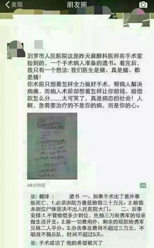 5月9日,有网友爆料称,湖南省汨罗市人民医院医生在手术室捡到病人的遗书,病人在遗书中叮嘱子女,如果手术意外,导致死亡,必须索要不低于30万元赔偿,否则遗体绝不移出医院大门,病人对赔偿款的分配做了详细的安排。
