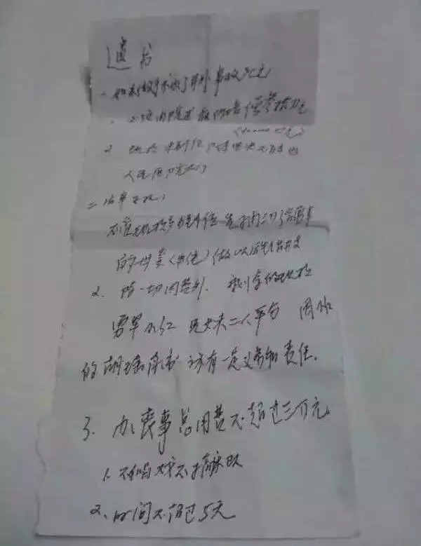 这份手写的遗书内容为:一、如果手术出了意外事故死亡,1.必须由院方最低赔偿三十万元。2.赔偿未到位,尸体坚决不出人民医院大门。二、后事安排:1.不管赔偿多少到位,先抽三万给勇军的母亲做生活开支。2.除一切费用外,剩余的现款给勇军兄妹二人平分。3.办丧事总费用不超过三万元,不唱戏,不搞乐队,时间不超过5天。