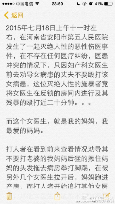 2015年7月19日,新浪微博名为@绝望的医生女儿发微博称:2015年7月18日上午十一时左右,在河南省安阳市第五人民医院发生了一起灭绝人性的恶性伤医事件,在没有任何医疗纠纷的前提下,只因妇产科女医生前去劝导女病患的丈夫不要殴打该女病患,这位灭绝人性的施暴者竟将女医生在反锁的房间内进行及其残暴的殴打近二十分钟。。。而这个女医生,就是我的妈妈