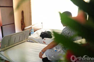 8月22日,坐在病床上的伤者李医生。(三亚新闻网记者沙晓峰摄)