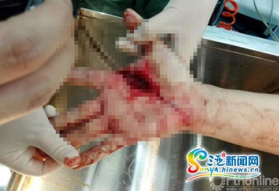 据悉,事发当天下午5点多,李医生在三亚市人民医院手术室内接受了缝合治疗。因及时用手握住刺向胸口的刀刃,险遭不测的李医生右手受了重伤,伤口长约10公分,从右手掌内侧拇指和食指连接处斜着延伸到手腕。