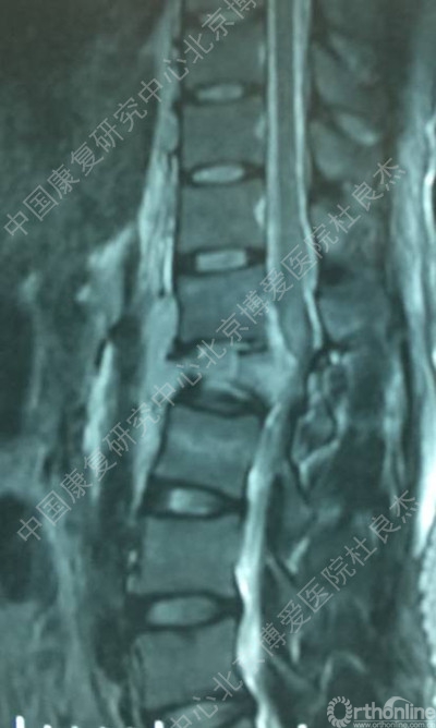 伤后当天在全麻下行“后路探查减压复位椎弓根钉内固定植骨融合术”。手术后给予综合治疗,患者双下肢肌力较术前好转,但仍存在无力及感觉异常,大小便功能无明显改善。为进一步康复治疗及训练就诊中国康复研究中心北京博爱医院,以“腰椎骨折术后并脊髓损伤”收住院。患者近期精神、饮食、睡眠好,小便留置尿管,大便需借助开塞露。