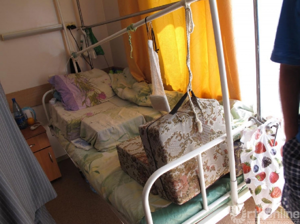 随后,我们见到的是12岁的女孩Anna(见图四),米哈伊教授介绍到,她是因髋关节发育性脱位(DDH)就诊的,目前正在接受Ilizarov髋重建(骨盆支撑截骨术)治疗。据资料显示:对于这种晚期髋关节发育性脱位的治疗,患儿不宜采用髋关节置换术,为此,目前国际上许多国家都在采用Ilizarov髋重建技术来治疗那些不适宜接受髋关节置换的患儿,如美国、意大利、埃及、印度及土耳其等国,我们国家的许多医院也已开展了此项技术,如国家康复医院矫形外科秦泗河教授等并取得了满意的疗效,但业内还存有不同的声音。为此,我们特别咨询了米哈伊教授关于该项技术的长期随访结果。他说:“这是一种成熟的手术,我们有很多经验,长期随访结果很满意。Anna已能扶拐下地行走,她现在正在输液,否则她是不会待在病房里的。”米哈伊教授幽默地笑道。聊天中得知,Anna是一个多才多艺的小姑娘,钢琴绘画非常了得,唯一的心病就是这条腿。她说,“等我病好了,我也要和同学们一起上体育课!”