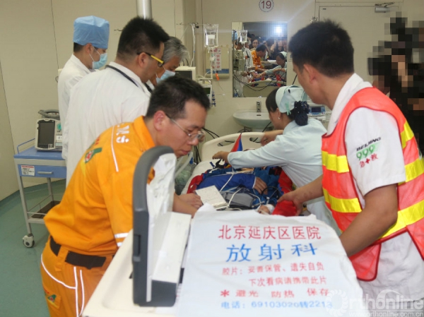 2016年7月27日上午8时许,一名31岁登山爱好者,不慎从高处坠落,造成颈椎骨折、骨盆骨折、股骨骨折、肩关节骨折、中度颅脑损伤、蛛网膜下腔出血、多发肋骨骨折、腹腔实质脏器破裂,在北医三院延庆区医院初步救治后,发现病情危重,需要转运到80公里以外的北京大学第三医院进行进一步治疗。999急救中心接到任务后,立刻派出直升机进行空中转运。45分钟后,病人被送至北医三院急诊抢救室。