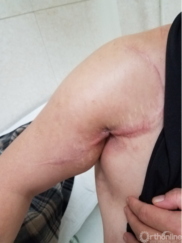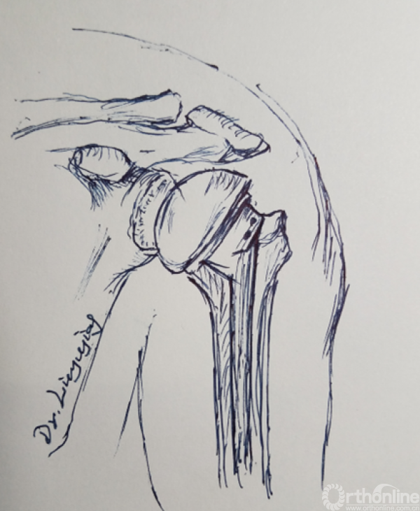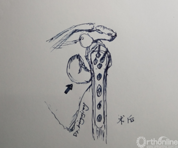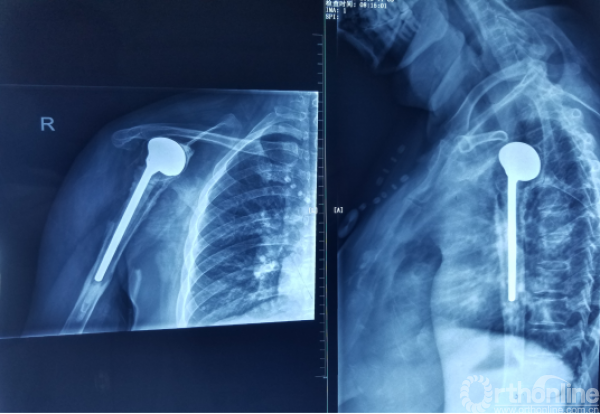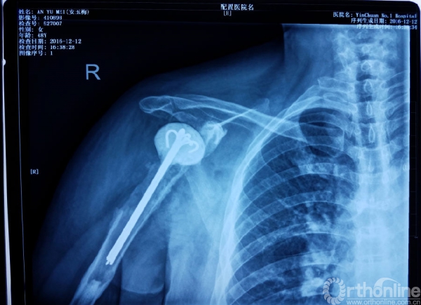 患者,女性,49岁,11年前因车祸致肱骨近端粉碎骨折(推测为NeerⅣ部分---骨折合并脱位),主管医师行急诊手术治疗(患者BMI>28);