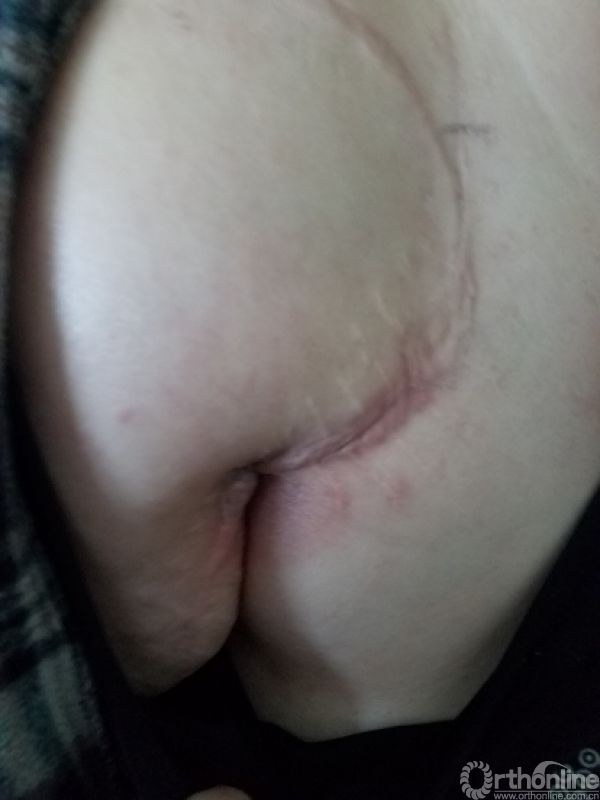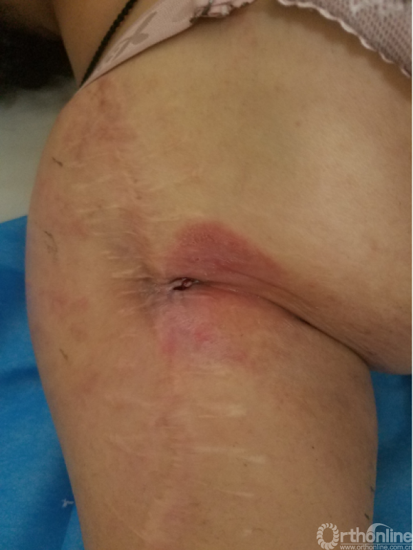 切口位于腋前线处局部皮肤红肿,皮温高于左侧,并可见窦道形成,有少许淡黄色分泌物溢出。