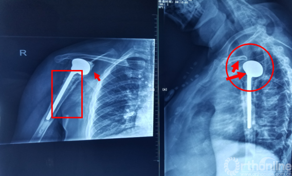 患者术后未行及时拍片,2周后第一次拍片发现肱骨头脱位依然存在,出现纠纷;一月后,请外地专家行二次手术,半肩置换。