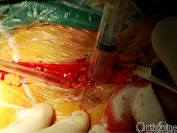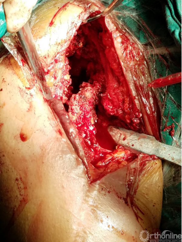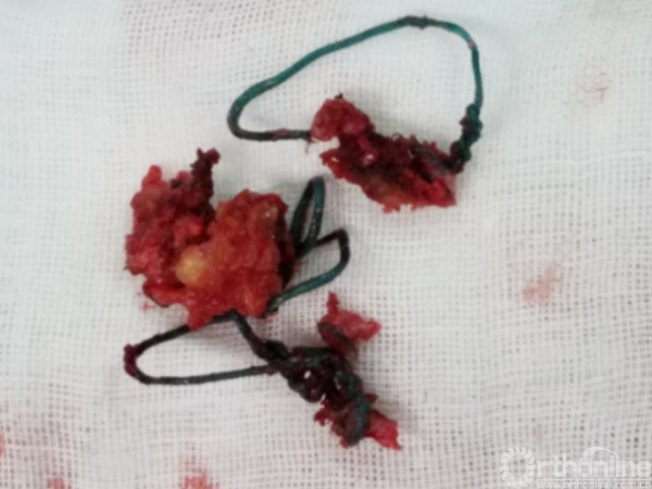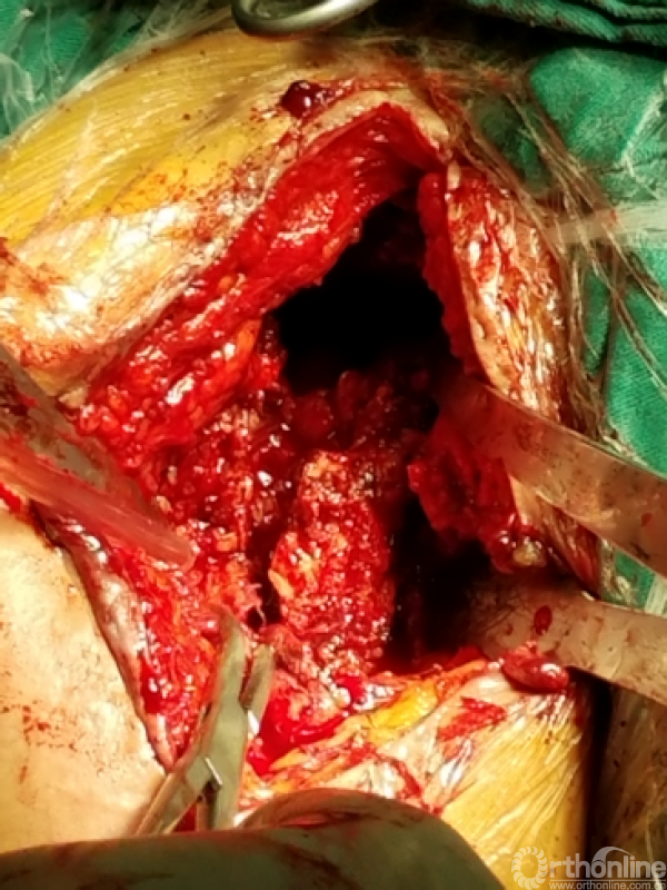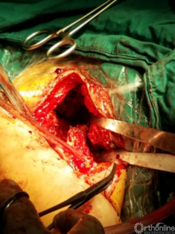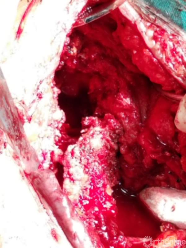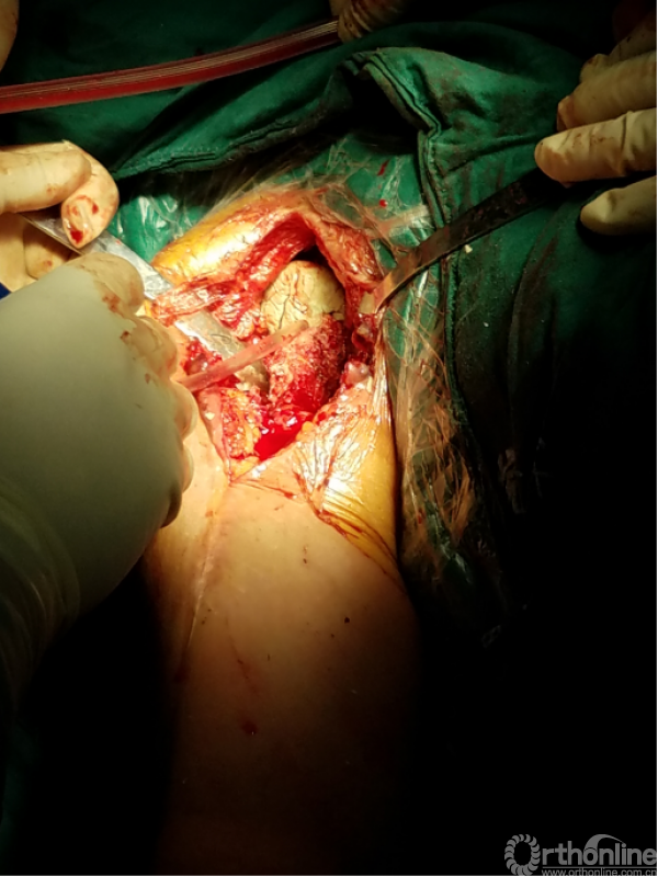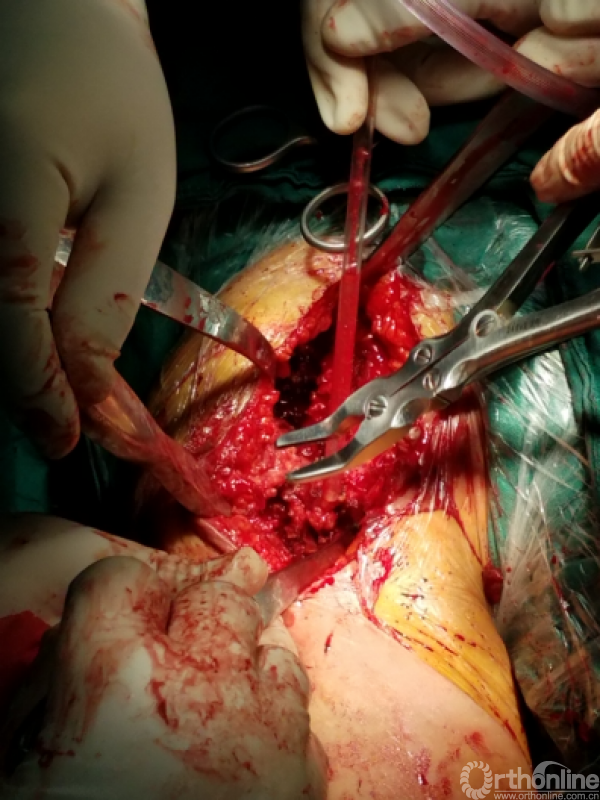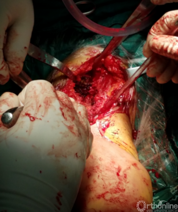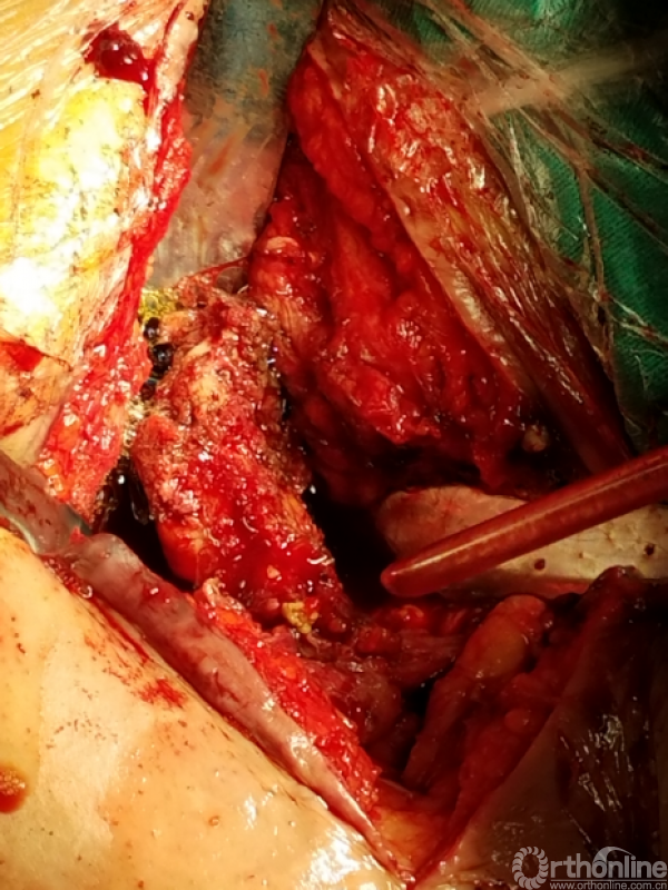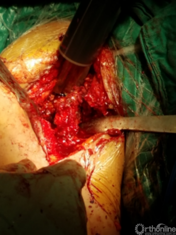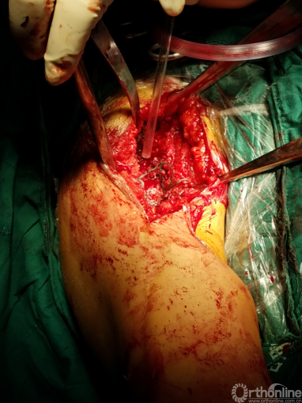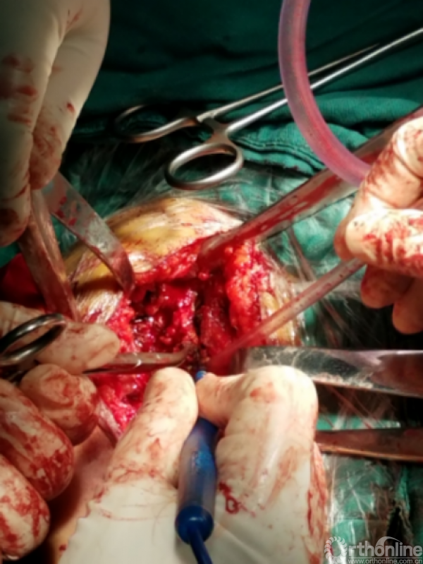咬出增生骨痂及清理瘢痕组织后显露出原肩袖缝线,杂乱,完整,表面见有脓性组织