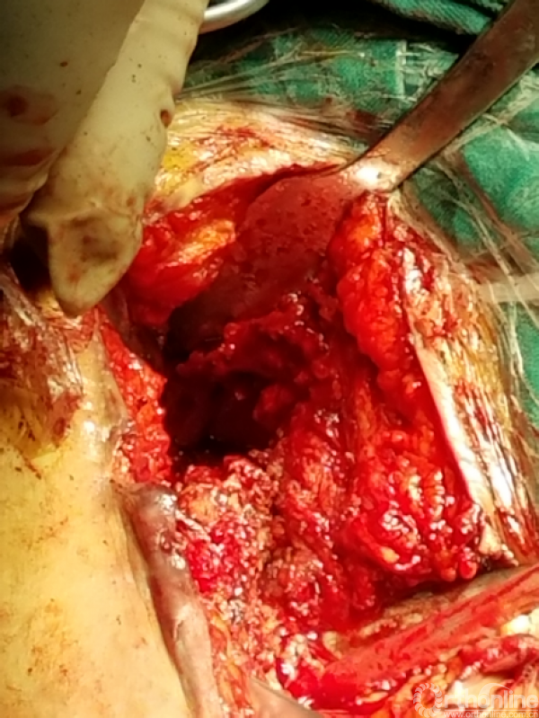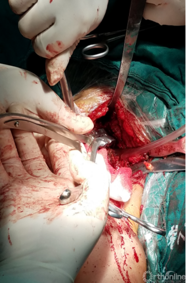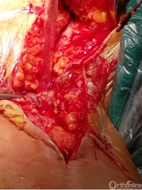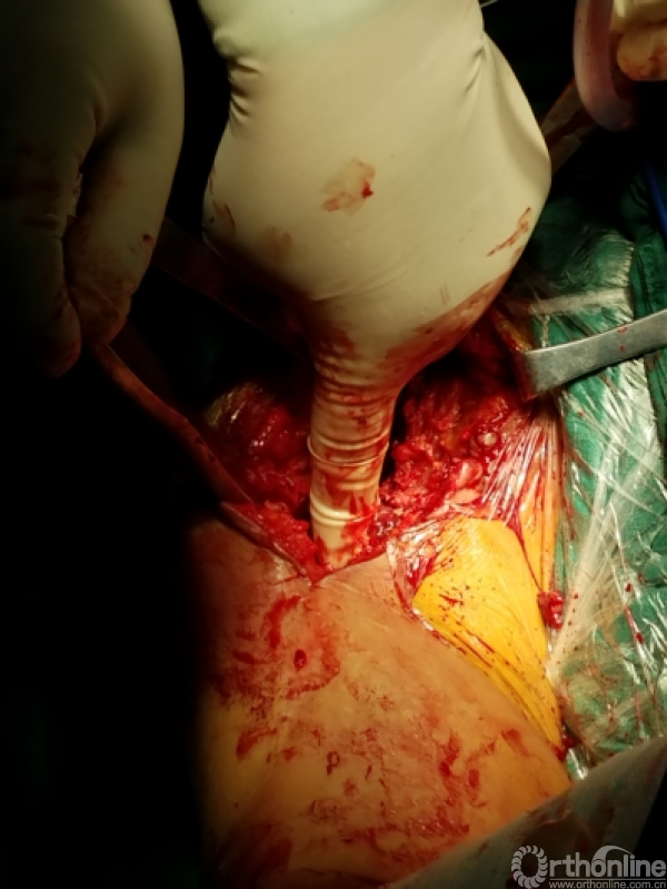 由于解剖结构紊乱,头静脉已消失。旋肱后动脉,弓状动脉剥离时出血,位于外侧转弯处,行填塞止血。