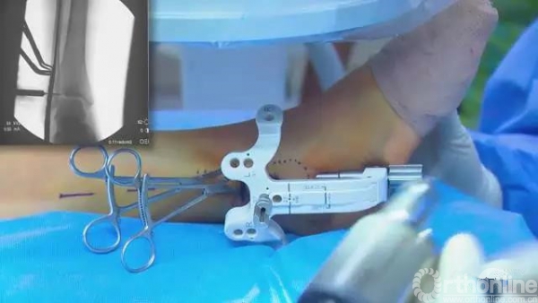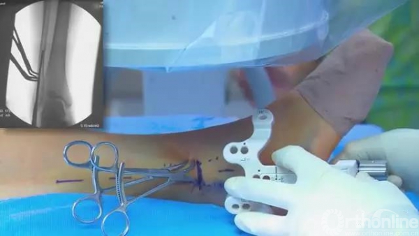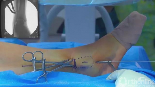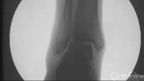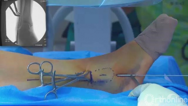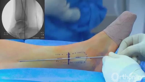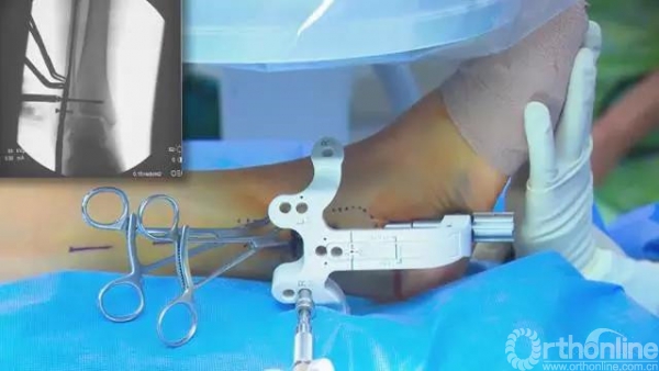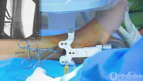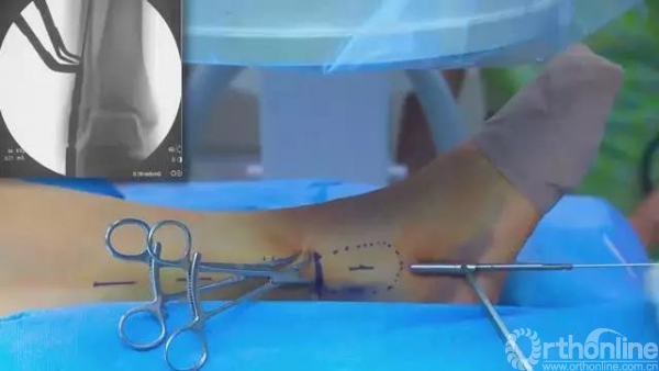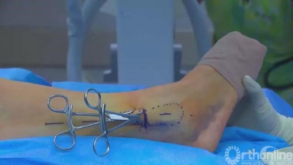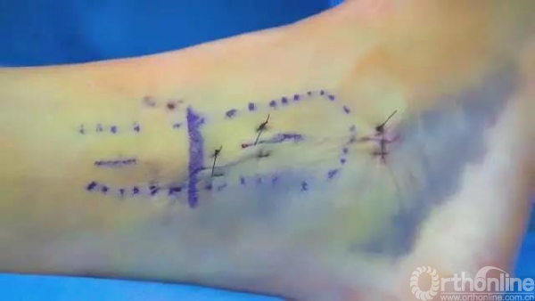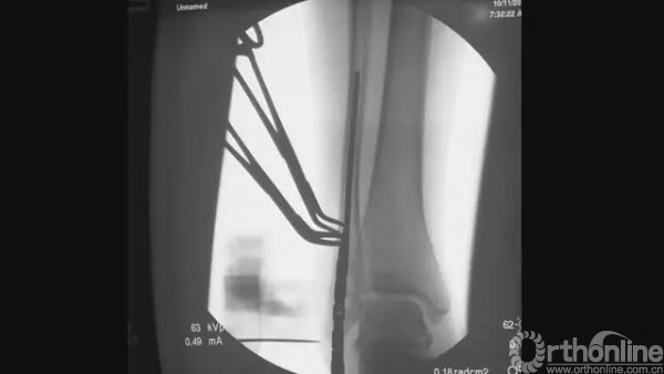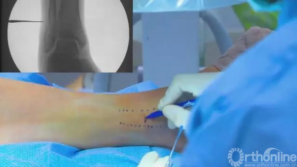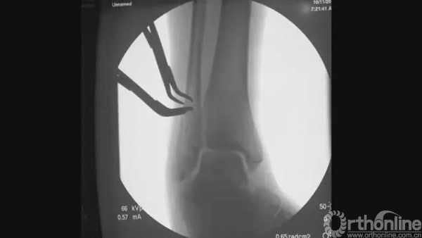 同时标记出骨折线的位置,并且用克氏针定位腓骨的正侧位轴线