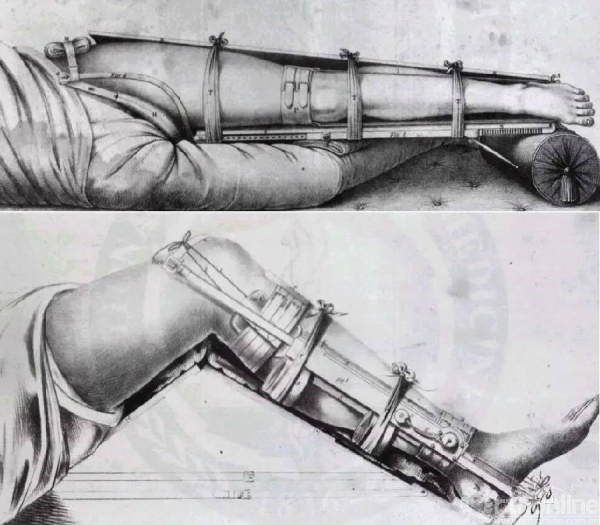 1561年的时候,法国理发匠兼外科医生 Ambroise Parre 发明了一种稳固骨折肢体用的支具,这是人类历史上记录较早的、以外固定手段处理骨折的方式——虽然从理论上讲,并非最早:因为有史记载,我国的孙思邈早在8世纪的唐代就已经探索了成熟的小夹板治疗骨折的方法。但Ambroise支具的科学意义无疑是值得重视的,500年后,我们日常所用的骨折外固定支具身上,依然能够看见它的影子。这里要补充一句的是,Ambroise Parre 的正式身份是“理发匠外科医师(Barber Surgeon)“。是的,你没有听错。中世纪的外科手术基本都是由理发匠来兼职完成的,两种手艺的共性是——都需要一把锋利的刀。在那个年代,剃头刀有时割须发、有时给战伤的士兵截肢,是一件很正常的事。