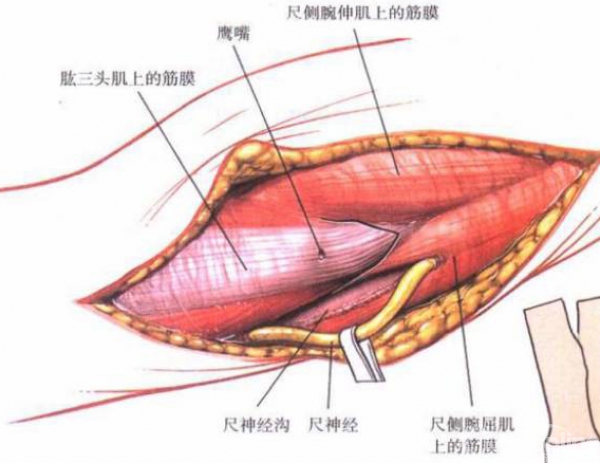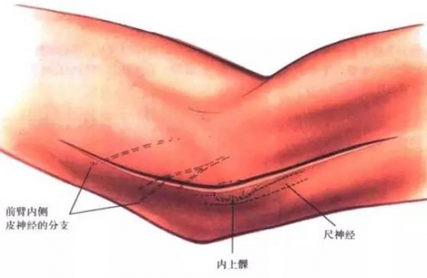 鹰嘴内侧向外转,再沿尺骨向下行;