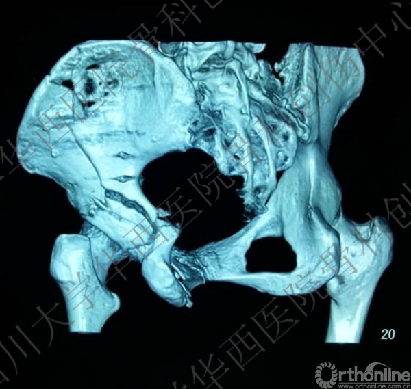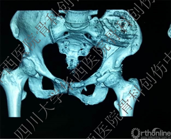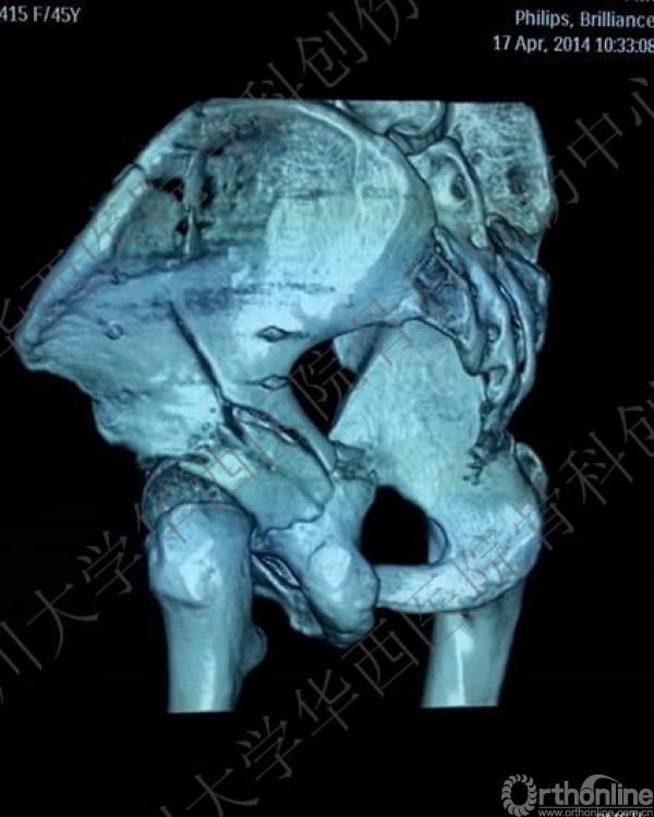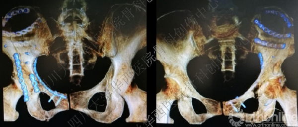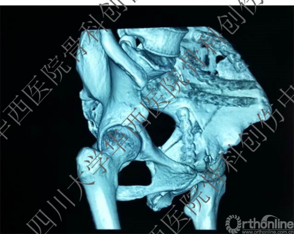 术后三维重建后面观,发现后壁的骨折有明显的移位,后脱位的风险增加,我们决定!