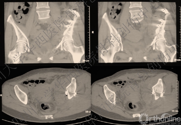 术后冠状位及横切面CT扫描,负重区解剖复位
