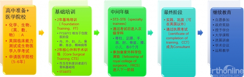 在英国培训一名合格的独立的专科医生从大学开始需经历≥15年的严格的、规范的训练。骨科(专科)医生培养体系分为五个阶段。