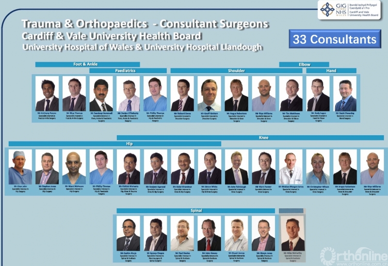 UHW属于卡迪夫大学医疗委员会(Cardiff & Vale University Health Board,欧洲最大的NHS组织之一),照护的人群为卡迪夫和Glamorgan地区的472400人口。UHW骨科分为脊柱、髋关节、膝关节、肩关节、肘关节、手外科、足踝外科和小儿骨科8个专业组,全科共有33名顾问医生,其中脊柱专业顾问医生7名。