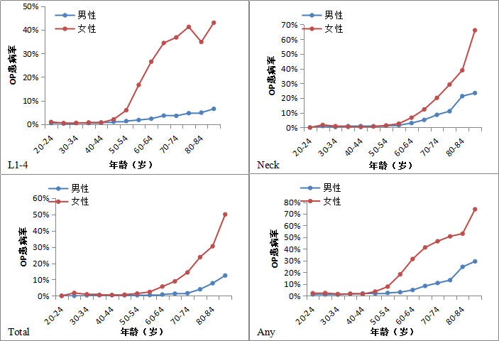 随着年龄增加,男女性的骨质疏松患病均上升,50岁以后女性OP患病率显著上升,明显高于男性(图3)。50岁以上人群骨质疏松总患病率(标化)男性为6.46%,女性为29.13%,按照2010年全国人口普查数据,现有OP患者男性10,879,115人,女性 49,286,542人。骨质疏松患病率最高的部位男性为股骨颈(4.58%),女性为腰椎(23.38%)。