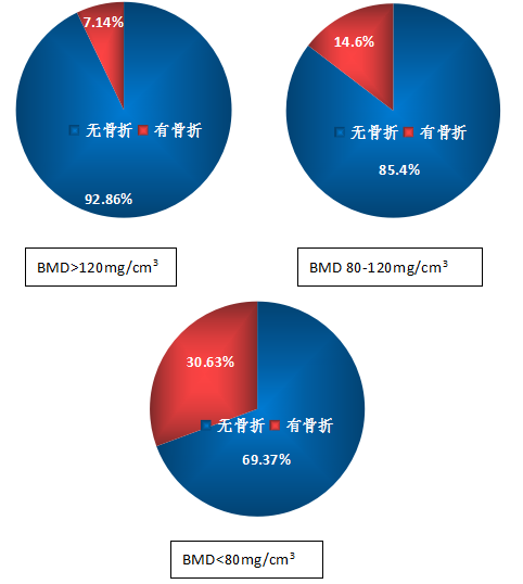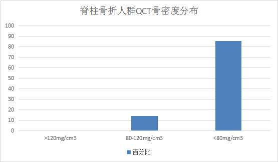 在骨质疏松性骨折人群,86%的人群骨密度<80mg/cm3,14%的人群骨密度在80-120 mg/cm3,没有人的骨密度>120mg/cm3(图3)。