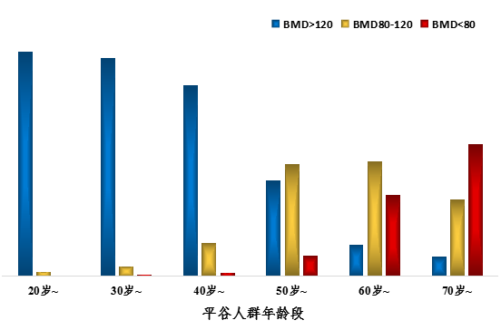 图4.平谷人群:不同年龄段中BMD分组构成(%)和骨质疏松患病率