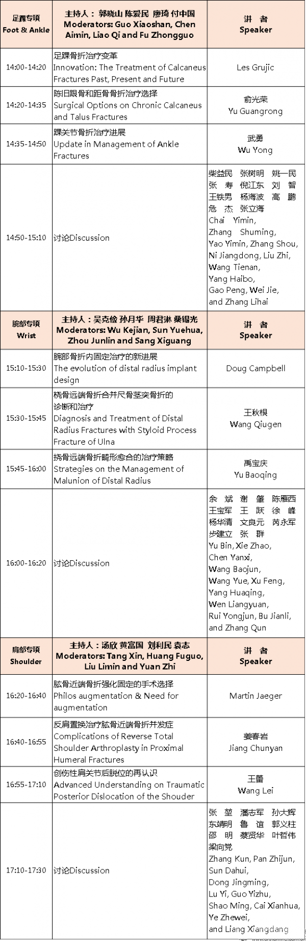 大会为期两天。第一天的内容针对国际、国内最前沿、最顶尖的学术问题,邀请来自德国弗莱堡大学综合医院的Dr. Martin Jaeger 、美国加州大学戴维斯全美一级创伤中心主任Dr. Mark Lee、澳大利亚麦考瑞大学医院的Dr. Les Grujic、英国利兹医院的Dr. Doug Campbell、泰国曼谷矫形中心的Dr. Suthorn等5个国家的全球著名创伤骨科大师和国内创伤领域的业界大咖姜保国教授、吴新宝教授、唐佩福教授、刘璠教授、张长青教授、余斌教授、张堃教授、柴益民教授就创伤骨科的最新问题、最新理念、最新技术进行一对一的专题对决。