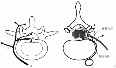 图2 A:节段动脉(A)发出三个终末支,前支(B)、后支(C)及中间支(D)。B:中间支发出的终末支有:1、至神经根的分支;2、至后方硬膜及椎管的分支;3、至前方硬膜及椎管的分支。