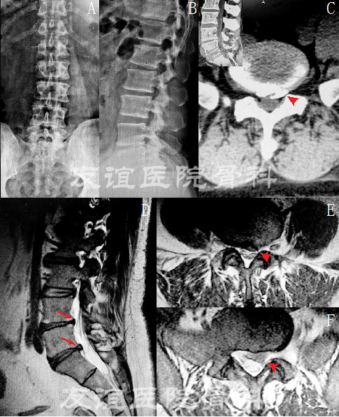 图1:术前影像学资料:腰椎正侧位片(A,B)提示:L4-5,L5-S1椎间隙明显变窄