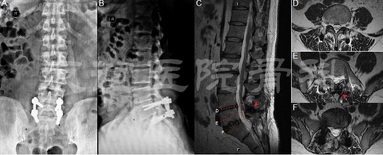 术前MRI(D-F)提示:L5-S1(F)左侧腰椎间盘突出压迫硬膜囊及左侧神经根,L4-5(E)左侧椎间盘突出。(红色箭头标记腰椎间盘突出)