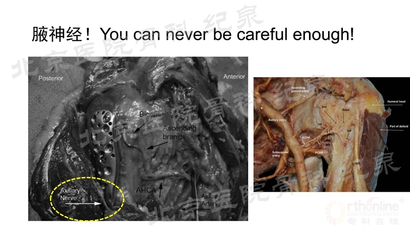 无论选用何种切口,减少软组织的损伤、保护血运、避免神经损伤非常重要,治疗中注意稳定的固定,需要良好的骨质量,肱骨后内侧的骨折复位良好,有助于稳定固定;注意肩袖修补并避免肩峰下撞击。