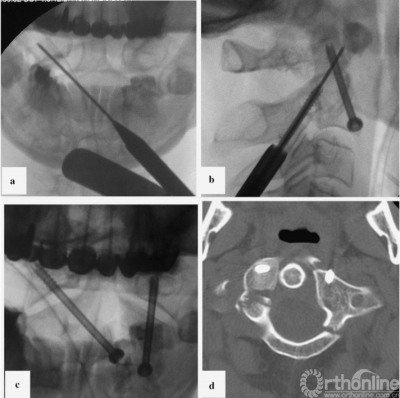 在双平面x线引导下,将K-wire穿过C2椎体下边缘并插入寰椎对侧侧块(图3a),并用其钻通骨隧道。在骨隧道中插如一根空心皮质内固定螺钉(直径4mm,长度38mm),螺钉头在C2椎体的位置有利于左侧关节的Reindl固定。然而,C2双侧侧块明显变薄(CT数据;图1,右)使得我们无法实施这种方法。