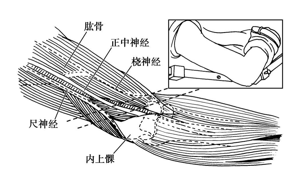 图2-3-7 上肢屈肘旋前固定于手术台边,可压迫尺神经