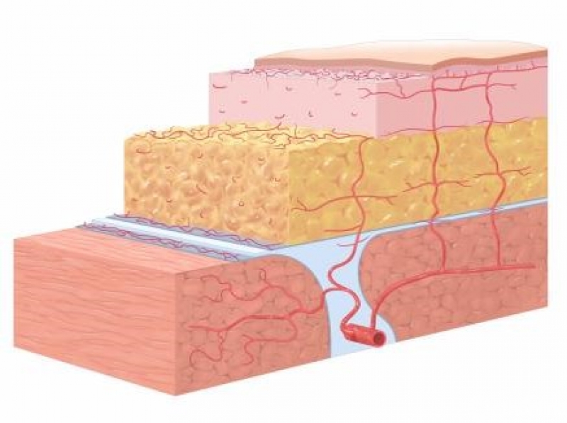 2. 由特定的动脉营养(伴随静脉),这些动脉通常在肌肉间/表面平行于皮肤走行,并发出垂直于皮肤的血管(除了皮下神经丛的血管)。