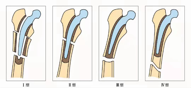 Ⅰ型:骨折线接近假体末端,假体柄仍然在髓腔内。
