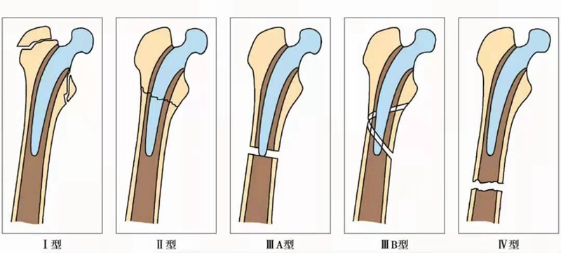 Ⅰ型:骨折累及股骨近端,常伴有大转子或小转子撕脱骨折。