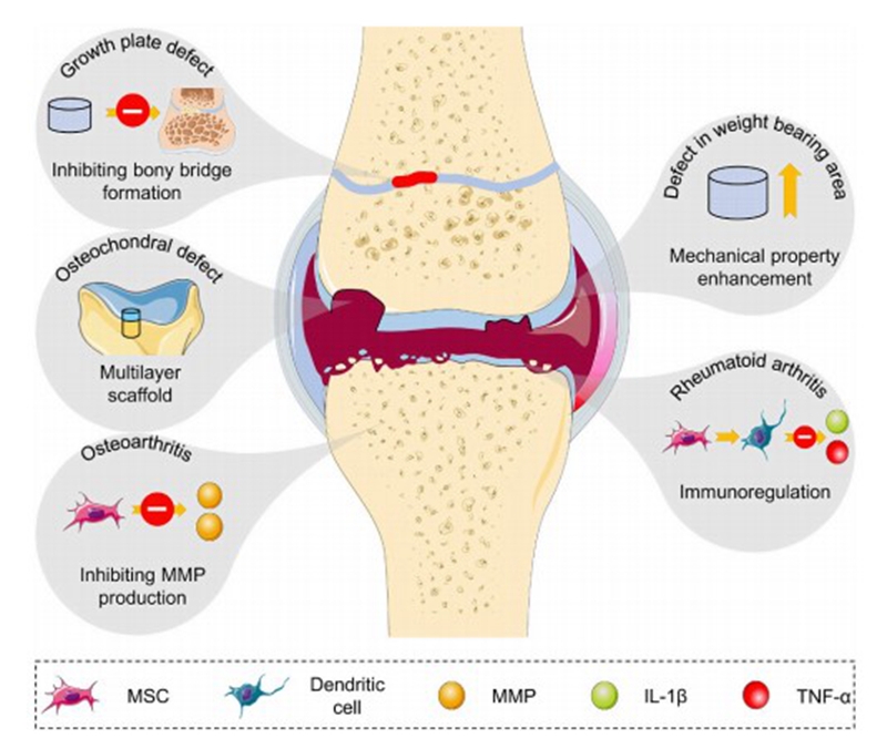 关节领域再生研究示意图:全层缺损、部分软骨缺损、负重区修复以及RA或OA环境下的修复(doi:10.1016/j.bioactmat.2021.10.002)