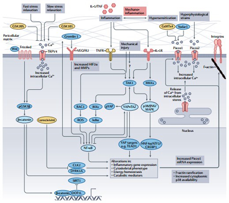 骨关节炎软骨细胞中的力学-炎症性信号通路(doi:10.1038/s41584-021-00724-w)